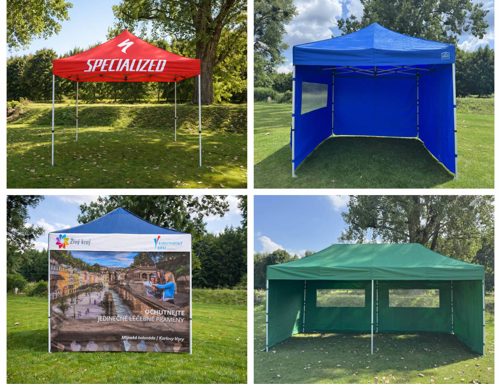 Jednodílná konstrukce stanu se snadno rozevírá a zavírá jediným pohybem bez použití nářadí během 1-4 minut podle typu stanu.