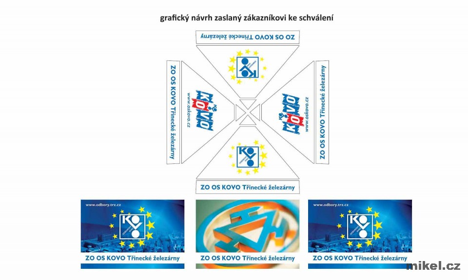Šablony jednotlivých stanových dílů pro vložení grafického návrhu najdete v Souborech ke stažení. Data k tisku je třeba zaslat v křivkách nejlépe v tiskovém PDF v dostatačném rozlišení, barvy definovány ve CMYK.