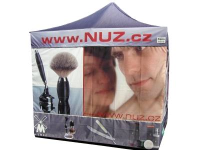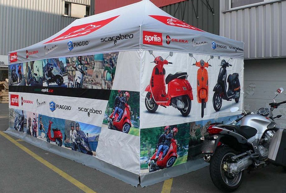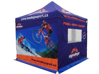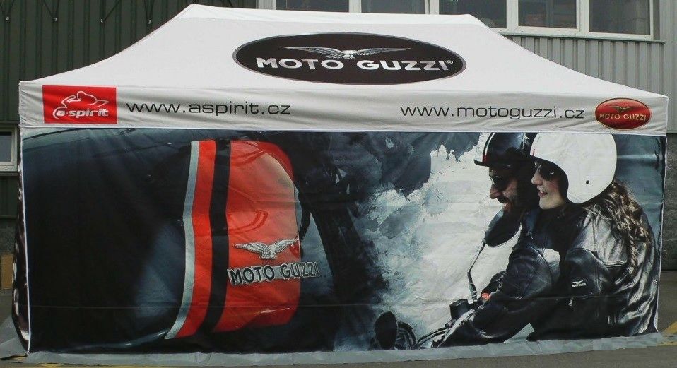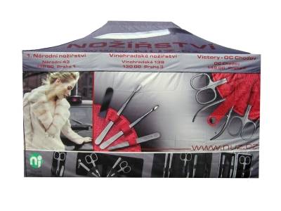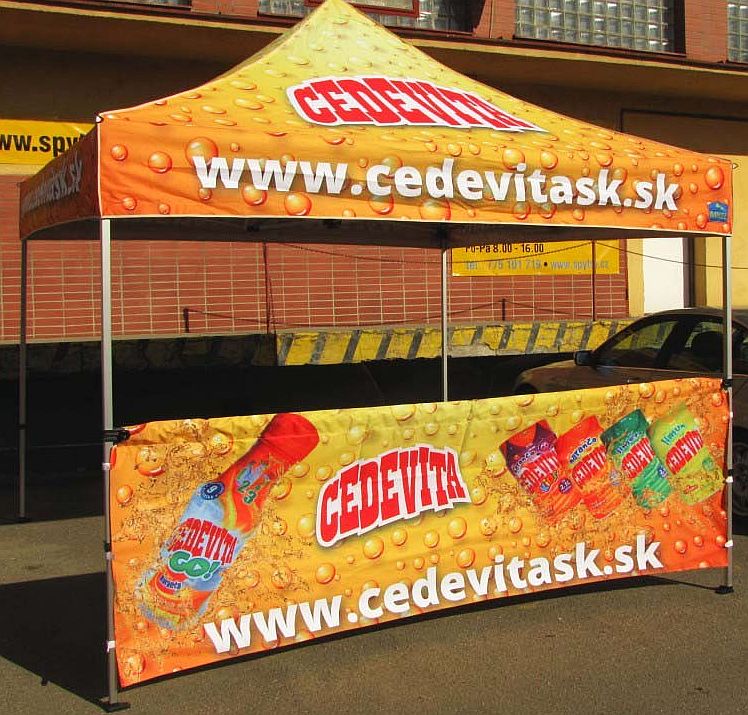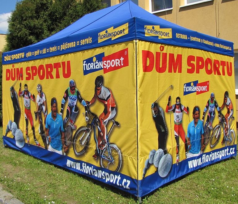 Plachtové díly nůžkových stanů dodáváme s digitálním CMYK sublimačním potiskem a to ke všem konstrukcím z naší nabídky tzn. od formátu stanu 2x2m až po 4x8m.